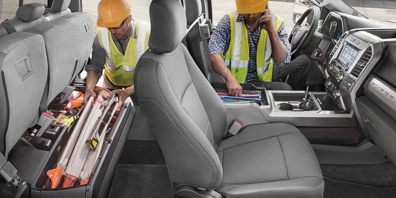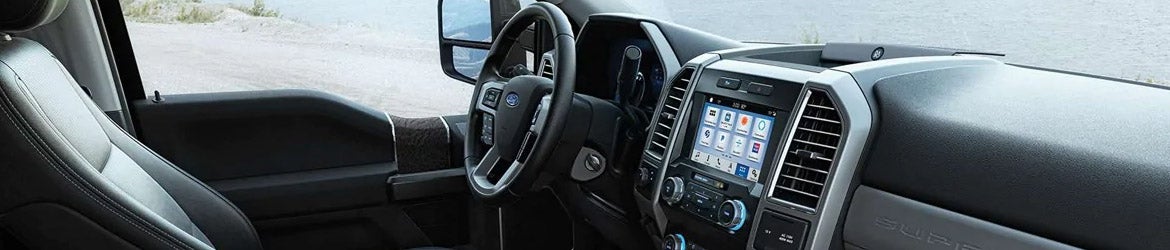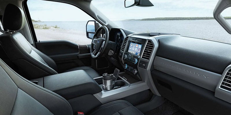 The cabin of the new F-250 is spacious, comfortable, and equipped with modern tech. With the XL trim, you'll get air conditioning, vinyl upholstery, and a rearview camera. The XLT trims offers the SYNC infotainment system with voice-command, a 4.2-inch display, a USB port, and SiriusXM. Other features added with this trim include lockable under-seat storage space, cruise control, and luxury cloth upholstery. <br></br> With the Lariat trim, you'll get the upgraded SYNC 3 infotainment system with Apple CarPlay and Android Auto compatibility, a Wi-Fi hotspot, and a Bang & Olufsen sound system. The trim also features dual-zone automatic temperature control, power-adjustable pedals, a self-dimming rearview mirror, a leather-wrapped steering wheel, leather upholstery, and power-adjustable front seats. Higher trims add a navigation system, upgraded leather upholstery, heated and ventilated front seats, driver-seat memory, heated rear seats, and remote start.