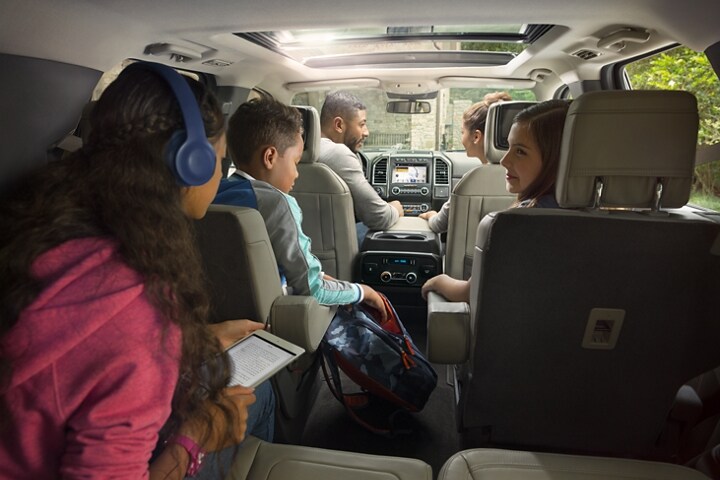 Eight passengers can ride in the Expedition with plenty of space for everyone to spread out. In the back of the regular model, the enormous cargo area can hold over 20 cubic feet of gear with all the seats up, and 63.6 cubic feet of gear with the third row folded down. The extended Max models have 36 cubic feet of cargo space behind the third row. Every 2021 Expedition has an 8-inch touch screen display and the SYNC 3 infotainment system along with four USB ports, Bluetooth, and a Wi-Fi hot spot. The SYNC 3 system works with Apple CarPlay and Android Auto for easy connecting and access to apps. Extra USB ports for the third row are an available option, and you can also get navigation, wireless charging, and a rear-seat entertainment system.
