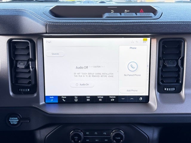 $4,788 off MSRP! 2025 Ford Bronco Oxford White Outer Banks 4D Sport Utility 2.7L EcoBoost V6 4WD w/360 Camera + Hard Top This Ford Bronco has many features and is well equipped including, 18 Bright Machined Aluminum Wheels, 360-Degree Camera, 4-Wheel Disc Brakes, ABS brakes, Adaptive Cruise Control, Auto High-beam Headlights, Automatic temperature control, Equipment Group 314A Lux Package, Evasive Steering Assist, Front fog lights, Front Parking Sensors, Fully automatic headlights, Heated front seats, Heated Leather-Trimmed/Vinyl Bucket Seats, Heated steering wheel, Information on Demand Panel, Low tire pressure warning, Occupant sensing airbag, Radio: B&O Sound System by Bang & Olufsen, Sideview Mirrors, SYNC 4, Universal Garage Door Opener. 19/21 City/Highway MPG